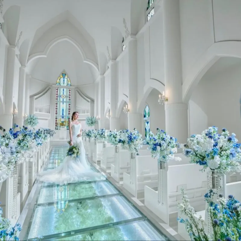 【白亜のチャペル】自然光降り注ぐチャペルで入場シーンを体験!扉を開けると広がるガラスのバージンロードの感動を体感。聖歌隊の生演奏とゲスト全員に見守られるチャペルで感動的なセレモニーを